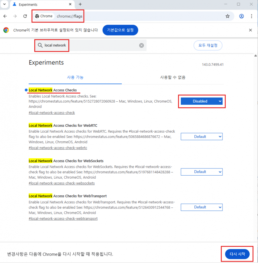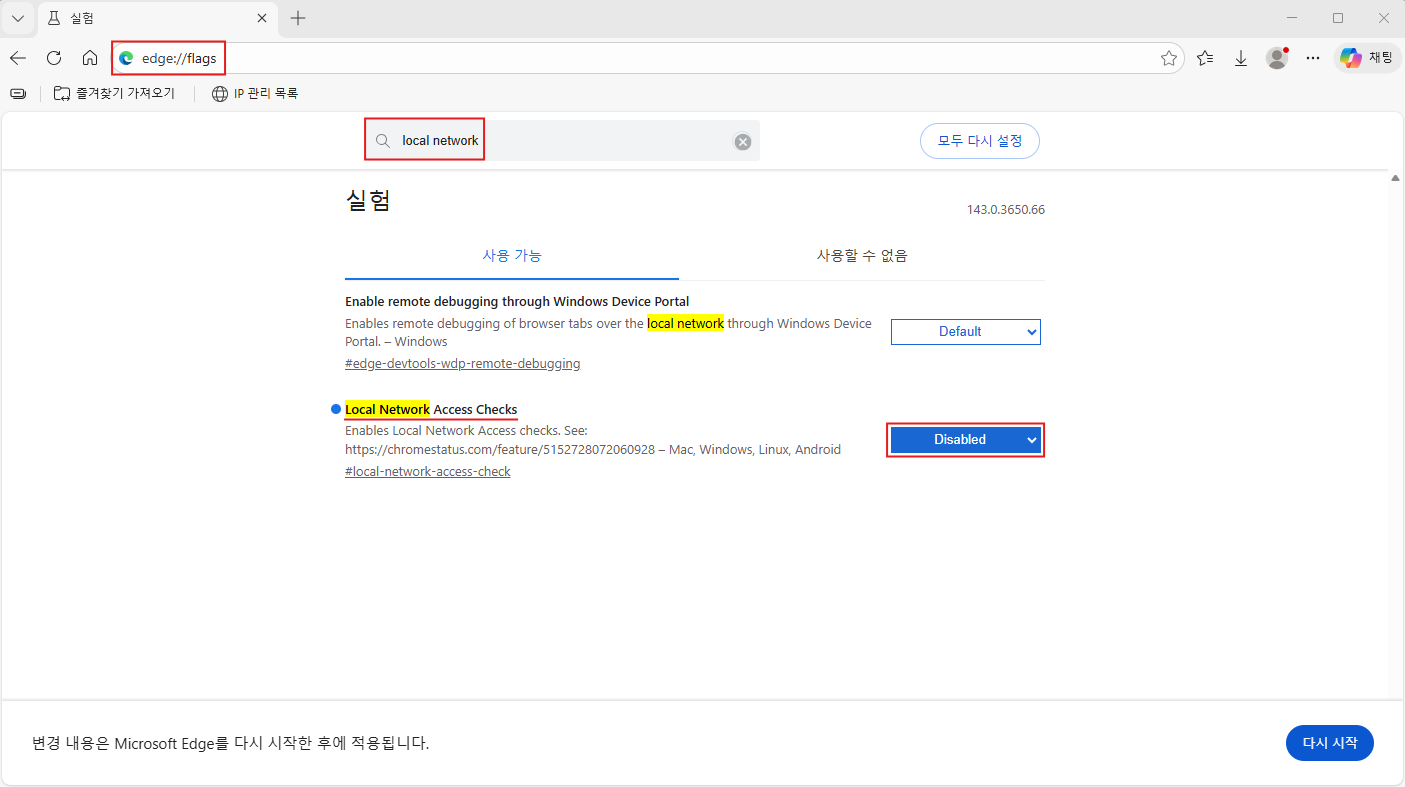 edge://flags,chrome://flags입력 - Local Network Access Checks → Disabled 로 변경